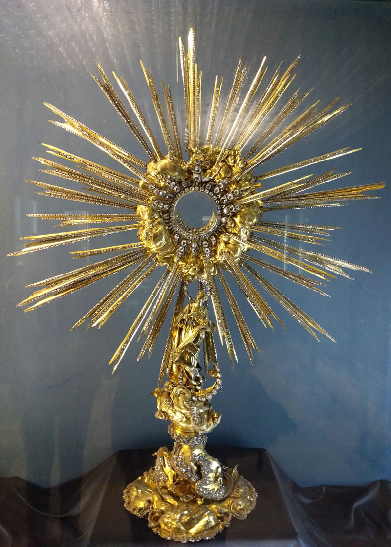 Höhepunkt der Sammlung ist sicherlich die 90 Zentimeter hohe, 12 Kilogramm schwere Diamantenmonstranz, die im Jahre 1699 in Wien von den Juwelieren Matthias Stegner und Johann Künischbauer aus vergoldetem Silber gestaltet wurde und über 6.000 Diamanten fasst. Strahlt die Sonne auf den mit Diamanten besetzten Strahlenkranz, leuchtet die Monstranz in einem unvergleichlichen Glanz. Darum wird dieses Kunstwerk auch die "Prager Sonne" genannt.
