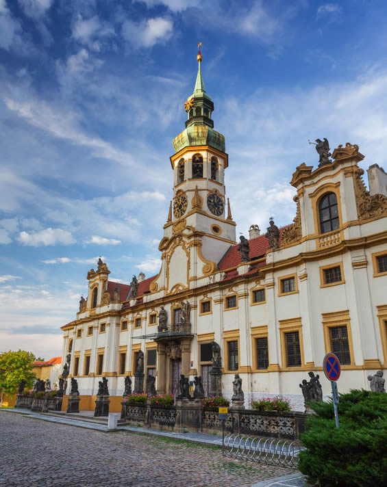 Von der Burg kommend, hält man sich am Hradschiner Platz (Hradčanské náměstí) links und geht einfach weiter auf die Loretánská und biegt dann rechts in den Loretánské nám. (Loreto-Platz). Mit der Straßenbahnlinie 22 oder 23 fährt man bis zur Haltestelle "Pohořelec", biegt dann links in die gleichnamige Straße ein, bis man in die Loretánská und schließlich zum Loretánské nám. gelangt.